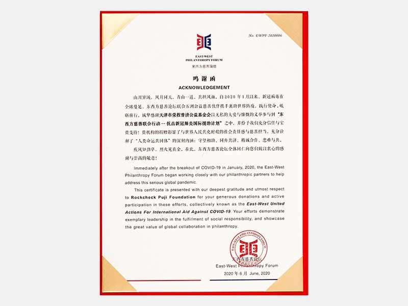 参与“东西方慈善联合行动-抗击新冠肺炎国际援助计划”鸣谢函