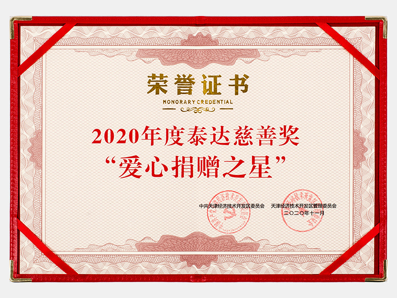 2020年度泰达慈善奖“爱心捐赠之星”证书