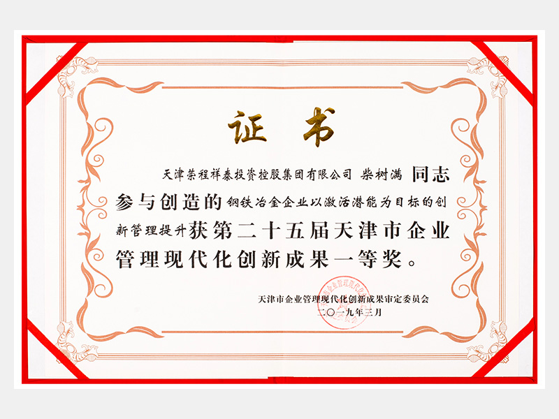 柴树满同志参与创造的钢铁冶金企业以激活潜能为目标的创新管理提升获第二十五届天津市企业管理现代化创新成果一等奖。