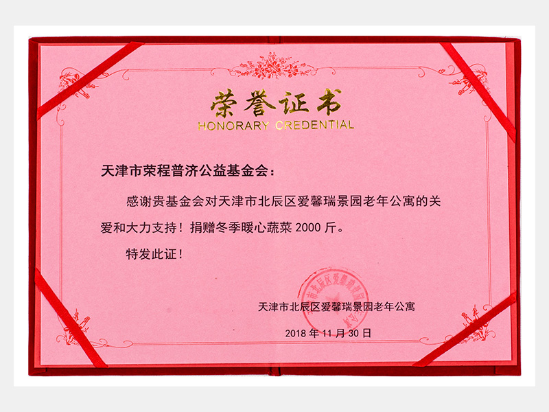 : 天津泰达国际养老院感谢捐赠证书(慈善)