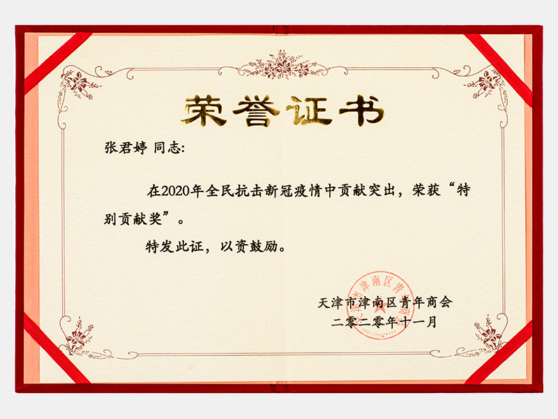 在2020年全民抗击新冠疫情中贡献突出,荣获“特别贡献奖”证书